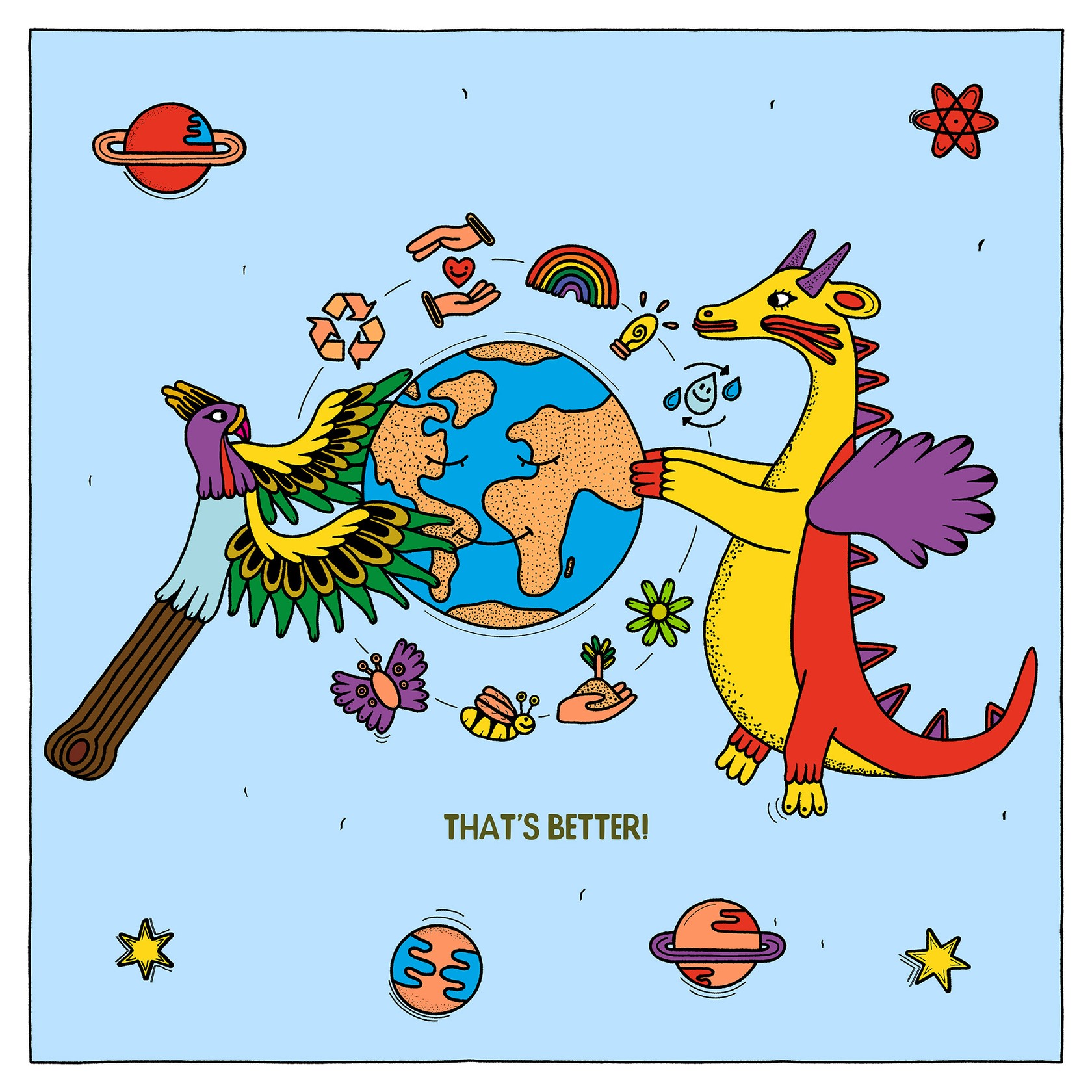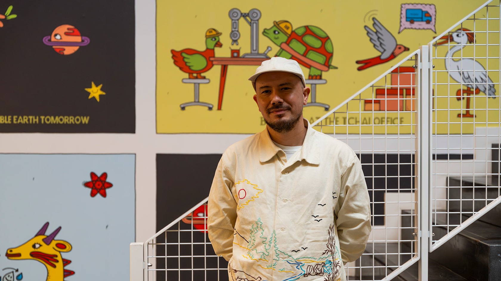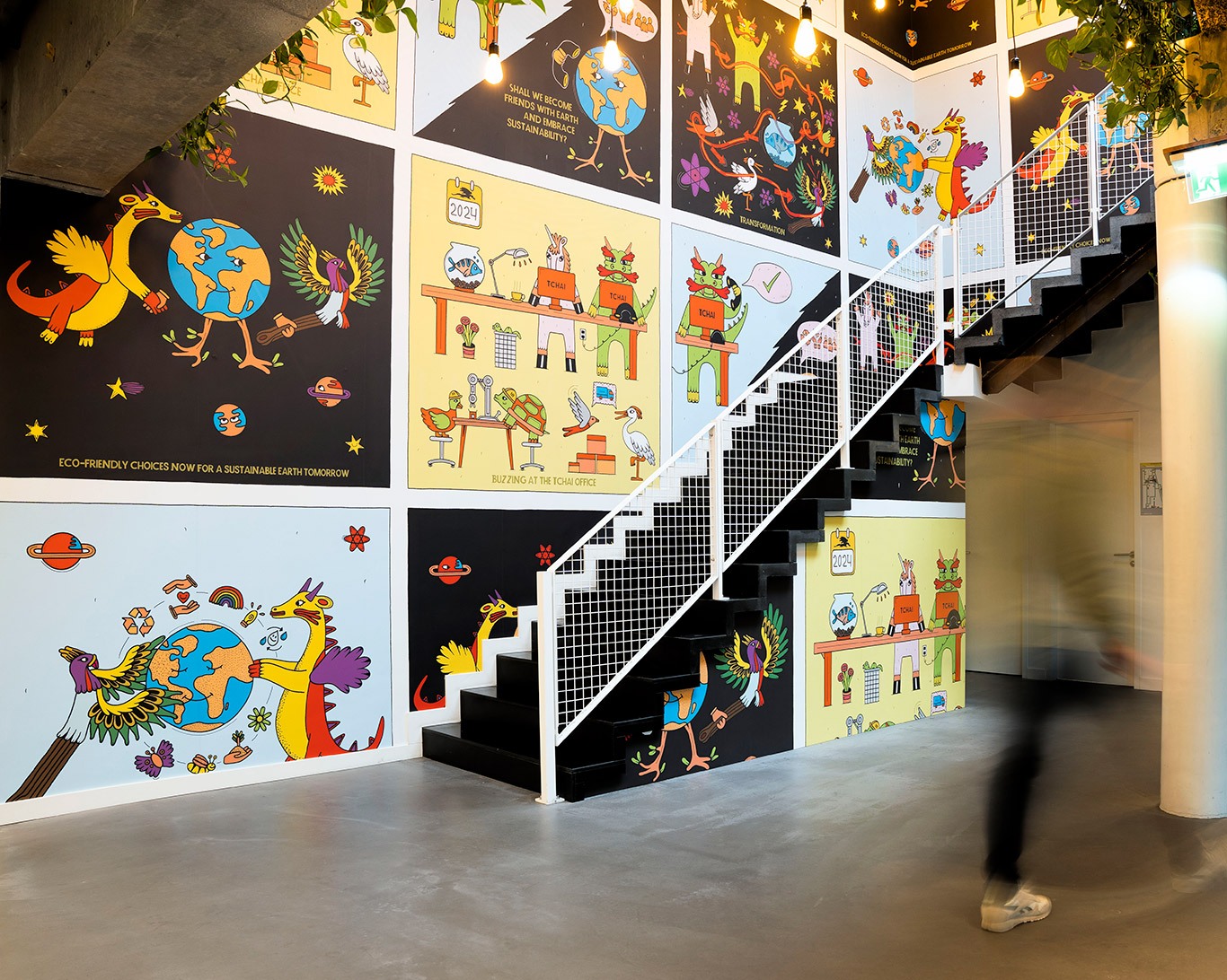 For this year’s installation, Saša Ostoja has crafted a short comic that speaks to the heart of our mission: channeling our energy towards building a more positive world. When approached by Tchai to create a piece for our office, Ostoja delved into the origins of the Feng Huang, the mythical Chinese Phoenix, which symbolizes the unity of all Tchai employees.
