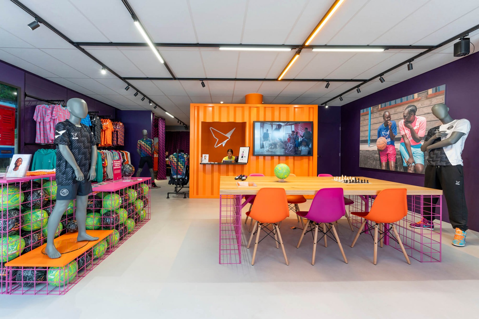 The KLABU humanitarian brand’s Clubhouse in Amsterdam functions as a versatile space, encouraging connections within the diverse Amsterdam community, encompassing locals as well as newcomers, including refugees, asylum seekers, and undocumented individuals. It serves as an office, central gathering spot and commercial store, featuring KLABU’s dynamic sport collections that contribute to refugee projects. The smooth integration of the brand narrative and sport collections in the design fosters a positive, bold, and impactful KLABU experience. What is essential is the warm reception and welcoming atmosphere upon entering the space, ensuring a pleasant and secure environment for all.